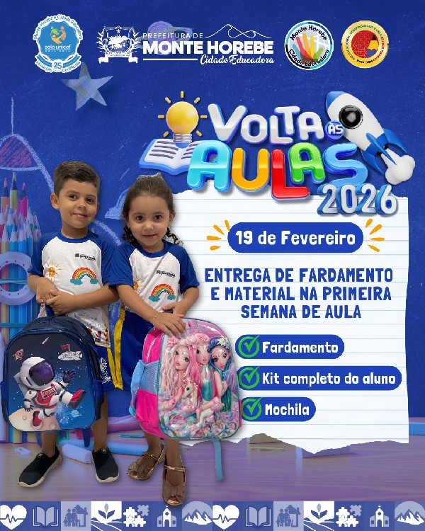 Na primeira semana de atividades, todos os alunos receberão o fardamento e o kit de material escolar, distribuídos de acordo com cada nível de ensino, garantindo que cada criança e adolescente tenha o que precisa para iniciar o ano letivo com qualidade.