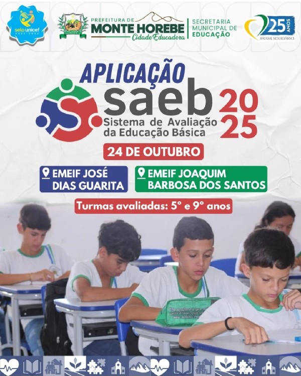 No dia 24 de outubro, Monte Horebe, a Cidade Educadora, foca as atenções na aplicação do SAEB 2025 para os alunos do 5º e 9º ano das escolas José Dias Guarita e Joaquim Barbosa dos Santos (Sítio Braga). Esta avaliação nacional é crucial, pois seu resultado, que compõe o IDEB, serve como um diagnóstico essencial para medir a qualidade do ensino e orientar o desenvolvimento de políticas públicas eficazes no município.