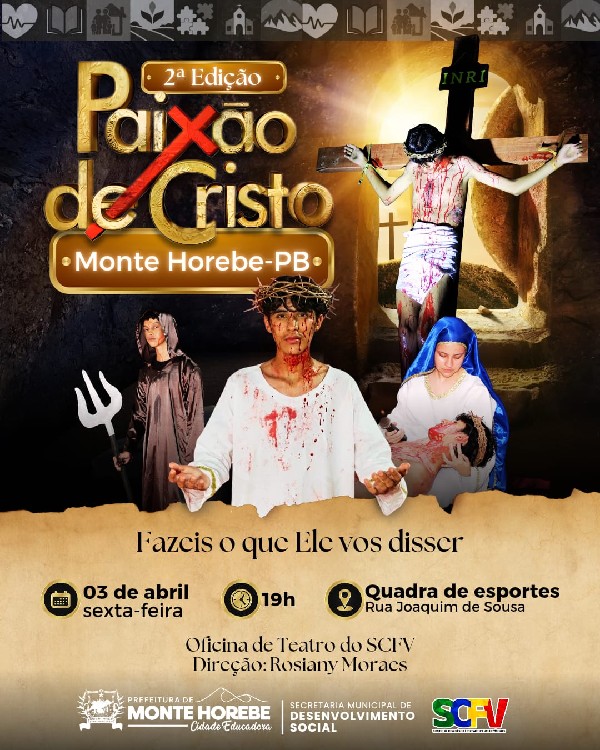 A Prefeitura Municipal convida a população para prestigiar a encenação da Paixão de Cristo. O evento, que faz parte do calendário cultural da cidade, promove a valorização das tradições locais e o acesso à cultura.
