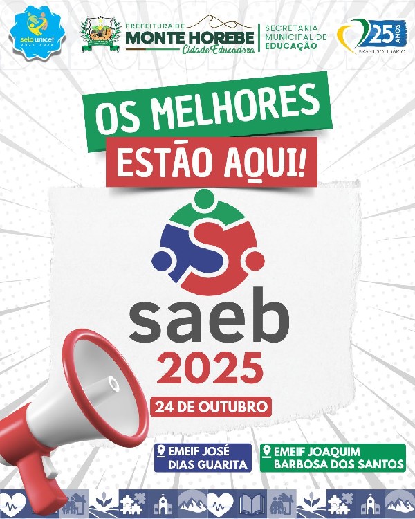 No dia 24 de outubro, Monte Horebe, a Cidade Educadora, foca as atenções na aplicação do SAEB 2025 para os alunos do 5º e 9º ano das escolas José Dias Guarita e Joaquim Barbosa dos Santos (Sítio Braga). Esta avaliação nacional é crucial, pois seu resultado, que compõe o IDEB, serve como um diagnóstico essencial para medir a qualidade do ensino e orientar o desenvolvimento de políticas públicas eficazes no município.