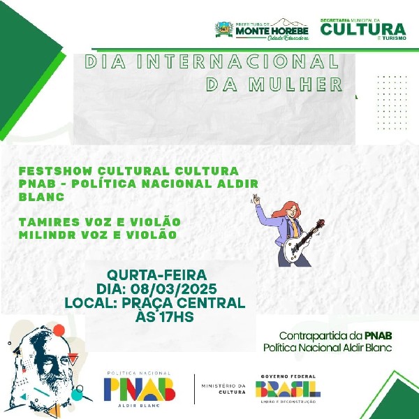 A Prefeitura Municipal de Monte Horebe, através da Secretaria Municipal da Cultura e Turismo, tem o prazer de convidar toda a população da cidade e região para uma noite especial de Apresentação Cultural com o projeto Voz e Violão.