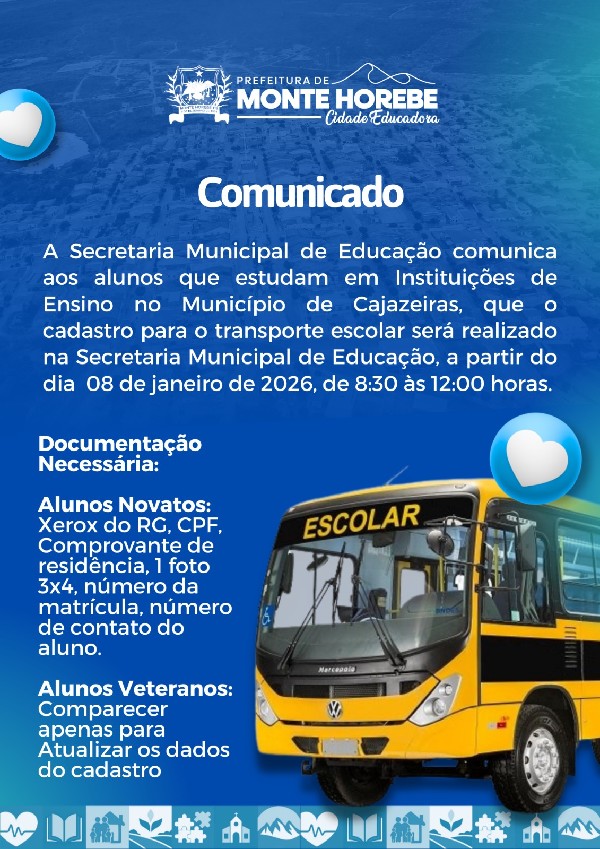 A Secretaria Municipal de Educação comunica aos alunos que estudam em Instituições de Ensino no Município de Cajazeiras, que o cadastro para o transporte escolar será realizado na Secretaria Municipal de Educação, a partir do dia 08 de janeiro de 2026, de 08:30 às 12:00 horas.